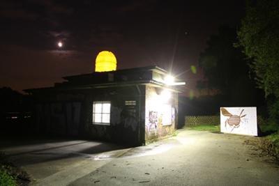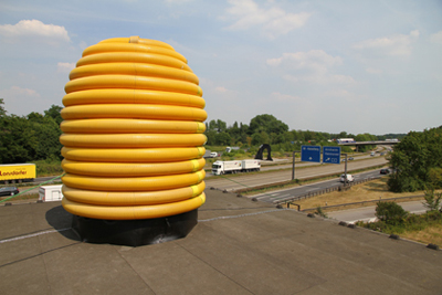 Natürlich bleibt bei dieser Tätigkeit das künstlerische Interesse nicht auf der Strecke. Der „Honig von der Pumpstation“ mitten im Autobahnkreuz Kaiserberg dient gleichzeitig als Forschungsmaterial der Künstler. Denn aus der Honiganalyse, die die beiden vornehmen ließen, lässt sich ein minutiös genaues Bild der Flora im Flugumkreis der hier 500.000 fleißigen Helfer von Finger erstellen. Die Tracht, die den Bienen in ihrem weiten Bewegungsradius von bis zu fünf Kilometern zur Verfügung steht, zeichnet sich durch eine unglaubliche Artenvielfalt aus. Von Majoran bis Honigtau erweist sich das Autobahnkreuz als Sortenreservoir der besonderen Art. Dies soll kein Plädoyer für den Bau neuer Großtangenten sein, wohl aber ein Statement für eine Entwicklungsfähigkeit dieser einzigartigen Kulturlandschaft im Schatten der Autobahn als biokultureller Spezialraum, den es nicht zu reproduzieren, wohl aber zu schützen gilt. Das hier in Kooperation mit der Imkerei Franz Schwanbeck eingetragene Produkt referiert auch auf die ungewöhnlich stark der natürlichen Umwelt zugewandte Produktion im Kreuz Kaiserberg und reiht sich so subtil in die Phalanx lokaler Produktionen von Delikatfisch Braun, Bauer Everts oder der sich selbst versorgenden Farm von Frau Höffler ein. Die Künstler verhelfen damit der hartnäckigen Widerständigkeit der Bewohner, die in einer Art Selbstverteidigung gerade an diesem Ort ihre Naturnähe behaupten, zu einer neuen Sichtbarkeit. Die Arbeit wird zum Kommunikator zwischen den Welten, wenn sie mit einem überdimensionalen beleuchteten Bienenkorb als weithin sichtbarem Zeichen dem unwissenden Autofahrer anzeigt, dass es hier unter den Fly-overs der Autobahn ein Leben jenseits der Schallschutzwand gibt, das ungeahnte Überraschungen birgt.