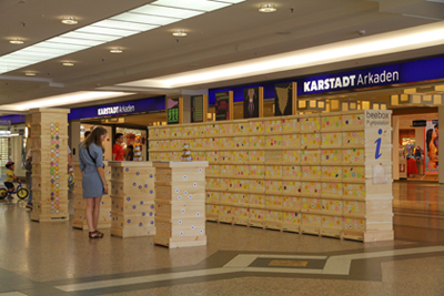 Das für alle deutlich lesbare Zeichen des Bienenkorbs am Autobahnkreuz Kaiserberg, das seine Sprache aus der Terminologie der Straße bezieht (siehe temporäre Verkaufsstände in Erdbeerform, Bratwürste als Imbissbuden etc.), verweist auf ein Folgeprojekt hier im RRZ. Denn das in dem Korb angelegte Versprechen von der Pumpstation wird hier eingelöst: Finger hat in der künstlerischen Shopping-Mall auf einer Aktionsfläche zwischen den Ladenlokalen einen Verkaufsstand eingerichtet, der die süßen Träume aus dem Biotop am Autobahnkreuz Kaiserberg verkauft, vermittelt und erweitert. Die „Beebox Pumpstation“ zeigt zum einen auf herkömmlichen Bienebeuten die grafische Umsetzung der Honiganalyse und deren faktische Ergebnisse. Andererseits setzt sie das lokale Produkt in einen globalen Vergleich: Beim mehrmals abgehaltenen Honigfrühstück hat der shoppende Passant die Möglichkeit einer Vergleichsverköstigung des neuen A40-Honigs, des Honigs lokaler Imker aus derselben Gegend und eines globalen „Cuvée“ aus internationalen, im RRZ erworbenen Honigen, die natürlich alles enthalten vom Naturprodukt bis zu genmanipulierten Rapspollen.