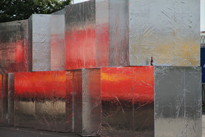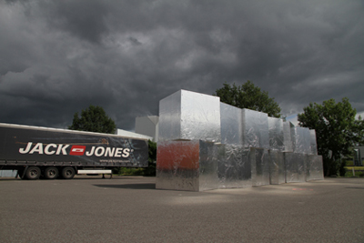 Das Ambiente der Parkflächen um die Shelltankstelle an der Vietingstraße wird für die globalen Trucker am Wochenende zur temporären Heimat. Der Ort, der als leere Fläche einer Architektur des steten Wechsels und der permanenten Neugestaltung Raum gibt, füllt sich am Wochenende mit den Ladeeinheiten und farbigen Logos der internationalen Handelsgrößen. Im „On-Demand- Zeitalter“ wird die Autobahn zum größten temporären Warenlager der Welt.Zwischen die Größen der Handelsunionen schiebt sich unauffällig die Arbeit von Martin Pfeifle. „Box 112%“ taucht im bildhauerischen Maßstab leicht vergrößert zwischen den mobilen Einheiten auf, um ihr volles Volumen in einer labil anmutenden Konstruktion zu spiegeln. Die lose aufeinander getürmten Volumina erinnern an verlorene Ladung und vergessenes Gut, an die Hinterlassenschaften eines globalen Transits: der Parkplatz als Kontaktzone, als unsteter Ort der Schnittstellen, der Verschiebung und Verklappung – Crashs bleiben da nicht aus. Die ramponierte Oberfläche der Arbeit spiegelt ihr wechselndes Umfeld, die Banner und Logos der globalen Märkte, um sie unmerklich zu zerlegen, zu deklinieren und zu neuen Zeichen zusammenzusetzen. Zwischen den Zeilen komprimiert sie den Ort zu einem fulminanten Spektakel der Waren, der Zeichen, der Farben und Größen, das im Nichts verschwindet, wenn sich der Parkplatz leert.Die Arbeit nimmt so den Ort in stringenter Weise wahr. In der Leere des Platzes, die täglich entsteht, wenn die Trucker weiterziehen, werden unmittelbar andere Konnotationen evident. Die Analogie zwischen der mobilen Architektur von Container & Co. und den hingeworfenen Quartieren der Gewerbeagglomerationen, die sich kubisch in endlosen Hallen entlang der Autobahn aufreihen, um in Form und Sprache dem ephemeren Blick des Fahrens Tribut zu zollen, bringt Pfeifle subtil zur Sprache. Wenn sich hinter „Box 112%“ der Monolith von ThyssenKrupp erhebt, reflektiert die Arbeit die rudimentären wie funktionsbezogenen Formen eines hochverdichteten Verkehrsraumes als nahezu plastische Werke enormen Ausmaßes. Dass Pfeifle dieser spröden Sprache einen intensiven Moment der Poesie verleihen kann, verdankt sich seiner genauen Beobachtung des Kontextes. Im subtilen Kommentar auf die Fluktuation des Ortes selbst erweist sich die Arbeit in ihrer labilen Struktur als einzig beständiger Faktor im Raum des Transits und konstituiert einen kurzen Moment der Kontinuität des Unbestimmten zwischen den lautstarken Sprachen der Straße.