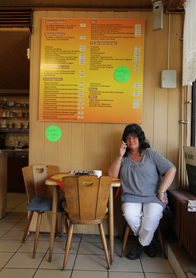 Man sähe die zwei Glatzköpfe, die sich über dampfende Kaffeebecher hinweg in polnisches Fernfahrerlatein versenken, während am Tisch gegenüber in breitestem Revierplatt über den Stau gemeckert wird, der sich vor den Tempo-30-Zeiten hier immer vorbeiwälzte. Sähe in der Ecke den Stapel Bild-Zeitungen zur freien Verfügung, den einbeinigen Ventilator am Fenster, der die Klimaanlage vorstellt. Die handgeschriebene Speisetafel, die von Hand gekneteten Frikadellen, das handgespülte Geschirr. Man sähe das Ruhrpottprinzip schlechthin, das Prinzip „Bude auffe Ecke“ kurzerhand eigenhändig direkt an die A40 rangeholt!