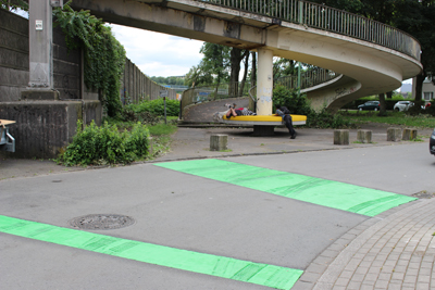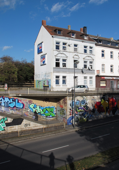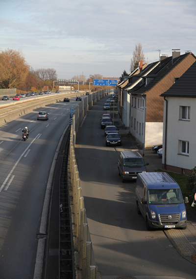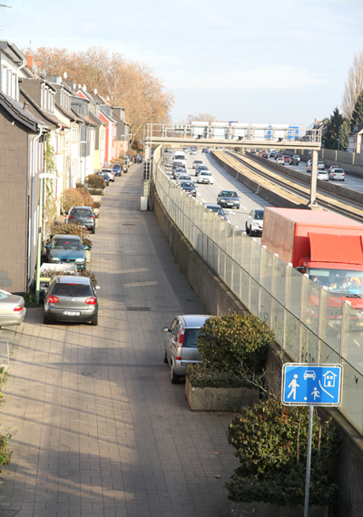 Wohnlagen wie die in Frillendorf zeigen, wie auch heute noch die Anwohner mit der Autobahn kämpfen. An der Anschlussstelle zwischen A40 und A52 wohnt man nur wenige Meter neben der Fahrspur in einem unvorstellbar harten wie wechselhaften Lebensumfeld. Wo mancher die Hölle vermutet, findet der andere sein kleines Paradies. An der verkehrsberuhigten Straße mit Körperkontakt zur A40 entwickelt sich im Zentrum Essens fast dörfliche Stimmung. Im großen Garten auf der anderen Seite der Häuser ist die Autobahn fast schon vergessen und der, der hier geboren wurde oder auch eine günstige Liegenschaft erwarb, genießt hier sein Eigenheim mit Autobahnblick. Das soll nicht darüber hinwegtäuschen, dass die Menschen hier mit ihren Problemen mehr oder weniger allein gelassen werden. Künstler thematisieren die brutale Zäsur, die die zur A40 ausgewachsene B1 hier quer durch das einstige Dorf getrieben hat, genauso wie die charmanten und intelligenten Strategien, mit denen sich die Bewohner hier häuslich eingerichtet haben.