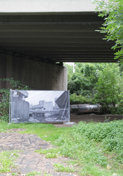 Elke Krasny führt entlang ihrer Arbeit durch die einzigartige Landschaft zwischen Autobahnkirche, Schlachthof und Tanzstudio. Fragen nach der Eigenständigkeit einer Gegend, die sich unbemerkt im Schatten der A40 hier gebildet hat und oft die Unsichtbarkeit am Rande der Autobahn nutzt, setzt sie in bildhafte Zeichen um, die sich entlang des Weges finden. Ein musealer Ort als Nukleus der Arbeit reflektiert in der Berggate 69 weitere Strategien einer Landschaft, die sich nahezu selbst entwirft.