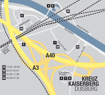 Im Kreuz Kaiserberg hat sich im Schatten der Großen Straße ein komplexer Lebensraum gebildet, den dort keiner vermuten würde. Ob der Zoo über der Autobahn oder Naherholungsgebiet, Schrebergarten oder Fischzuchtfarm, Wagenburg oder Siedlergemeinschaft, Bikermeeting oder Bauernhof: entlang des Weges wird die Fähigkeit der Menschen im Ruhrgebiet sichtbar, schwierigste Lebenssituationen positiv zu transformieren.