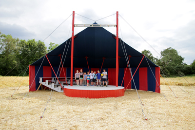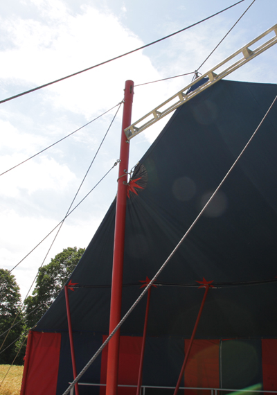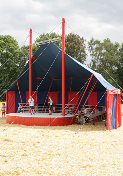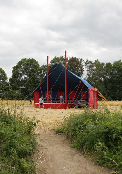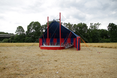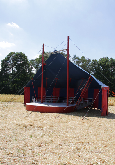 Das offene Zirkuszelt von Volker Lang ist Skulptur und Bühne zugleich. Wo der Zirkus früher das Magische und Phantastische in die industrialisierten Städte brachte, haben heute die Medien die Regie übernommen. Trotzdem hat die Manege, die sich in Langs Skulptur zum lokalen Publikum hin öffnet, nichts an Faszination verloren. Im Umfeld der Arbeit verweisen Plakate auf eine Geschichte des Zirkus, der in seinen Darstellungen nicht nur die Domestizierung von Welt und Natur thematisiert.